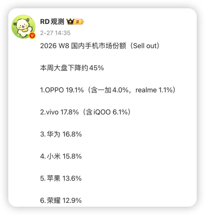 那么问题来了,既然iQOO莫得受到什么影响,而国内的手机市集又是存量竞争为主,那么这波竞争下来到底谁最受伤呢?